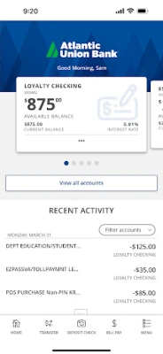 Start banking any time, any place with Atlantic Union Bank’s mobile banking. Available to Atlantic Union Bank customers, our app allows you to check balances, pay bills, make payments and transfers, make deposits, find locations and more.