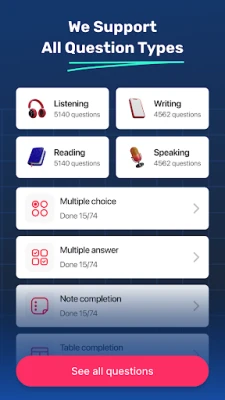 One IELTS provides 15,000+ practice questions and 1,000+ mock tests for all four IELTS sections: Listening, Reading, Writing, and Speaking. With these extensive materials, you can practice and master each part of the exam.